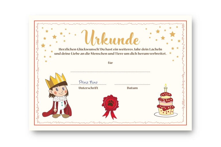 welch aufregender Tag! Ich, Prinz Nino, konnte es vor lauter Vorfreude kaum erwarten, allen im königlichen Schlossgarten von deinem Geburtstag zu erzählen. Du bist so außergewöhnlich, und deine Eltern sind zurecht stolz auf dich. Ich habe eine prächtige Geburtstagsparty mit all unseren tierischen Freunden für dich organisiert, um diesen besonderen Tag zu feiern. Ich hoffe, du strahlst vor Freude! Möge deine Einzigartigkeit immer leuchten!